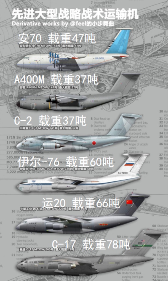 转发自微博feel的小步舞曲绘制的各国运输机尺寸对比图: