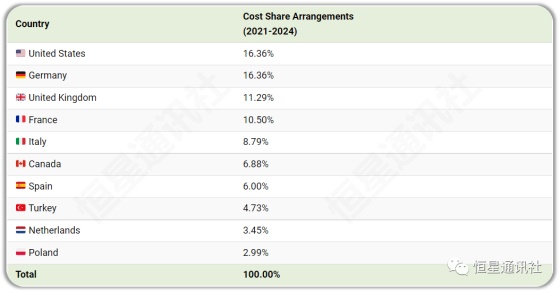 和美国相差十七倍的西班牙要承担相当于美国近四成的比例。