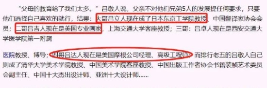 而吕敬人兄弟五人。其中三个都在国外,大哥吕立人是日本东京工学院教授、二哥吕吉人是美国专业画家、四哥吕达人则是美国摩根公司经理……