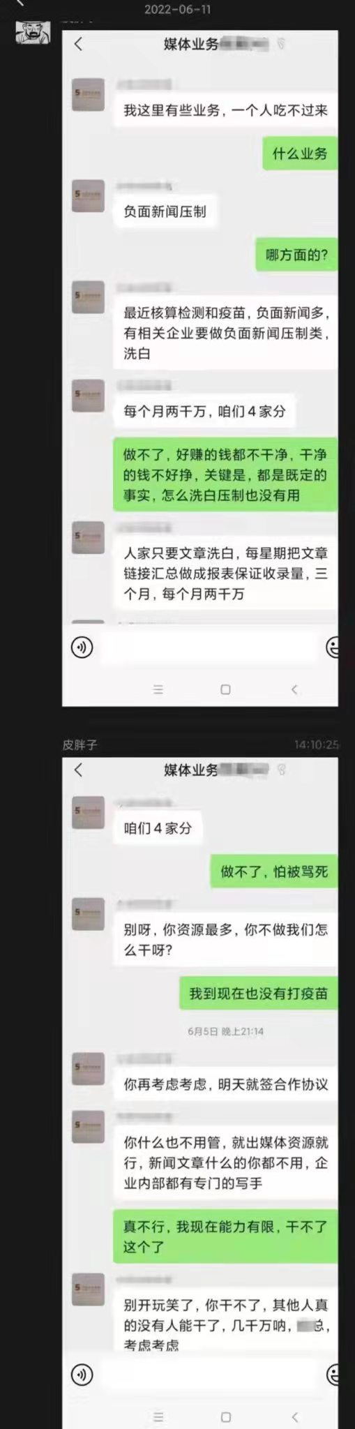 截图内容显示,某疫苗公司每月花2000万给传媒公司专门做负面新闻压制洗地,持续三个月,公司吃不下这单业务找合作方洽谈,被合作方以“不赚不干净的钱,怕被骂死”为由拒绝了。