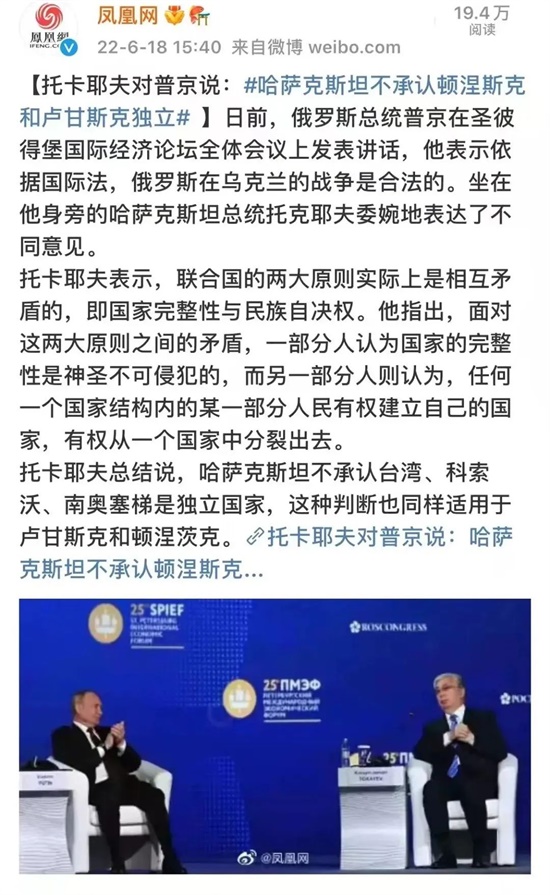 如此就不难理解哈萨克斯坦总统托卡耶夫在圣彼得堡经济论坛上的发言。这既是对俄罗斯的示威,也是对全世界的声明——不要再试图用武力控制我,不要借口保护俄族对我搞武装侵略,我要和你分道扬镳,大路朝天各走一边,我要另寻出路。