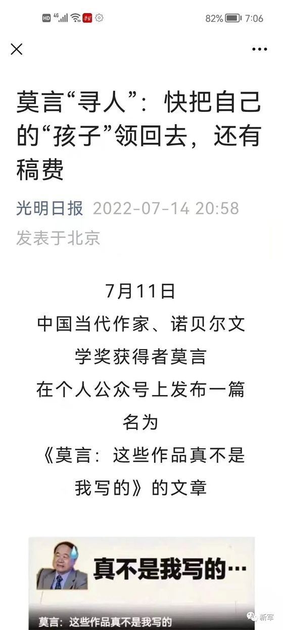 这些风靡互联网的“莫言说”,为什么直到10多年以后的今天,才于2022年7月11日在莫言个人公众号上,宣称网上很多“莫言作品”都不是他本人写的,但他钦佩这些冒名作者的才华,也为这些作者放弃自己的著作权而感到惋惜。