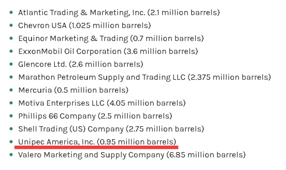 于是,在今年4月的时候,16家美国和外国石油企业在美国的分公司便参与了当时3000万桶原油的竞价。根据美国能源部化石能源和碳管理办公室官网的消息,有12家企业最终赢得了此轮竞价,其中就包括联合石化的美国分公司。只不过这3000万桶的大头其实是被美国企业获得了,联合石化美国分公司只获得了95万桶。