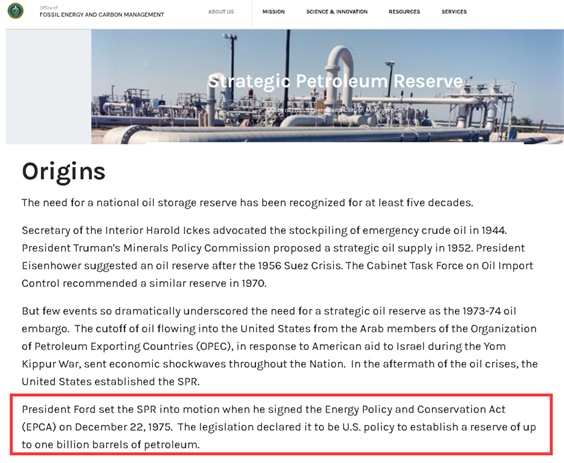 根据美国能源部化石能源和碳管理办公室官网的介绍,美国这个“战略石油储备”是于1975年12月22日建立。此前,在1973年到1974年间,美国因支持与阿拉伯国家开战的以色列而遭到了阿拉伯国家的石油禁运制裁。这令美国的决策者意识到,美国必须建立一个战略石油储备机制保护自己的能源乃至国家安全,在遇到诸如石油禁运这种地缘政治危机时可以拿出来缓解国内的供应危机。