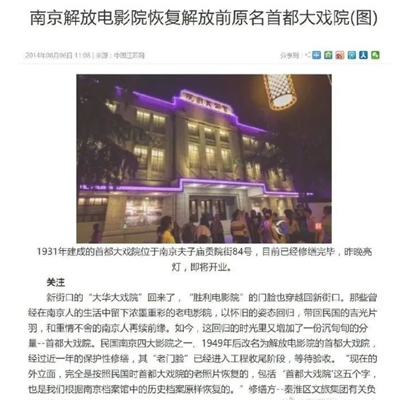 第三:2014年8月,把“解放电影院”恢复解放前的原名“首都大剧院”。