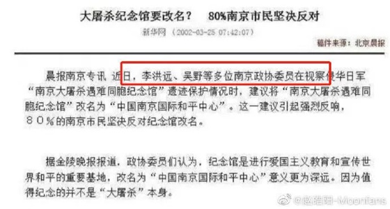 第一,在2002年3月时,有多位南京市政协委员居然建议“南京大屠杀遇难同胞纪念馆”改名为所谓的“中国南京国际和平中心”。