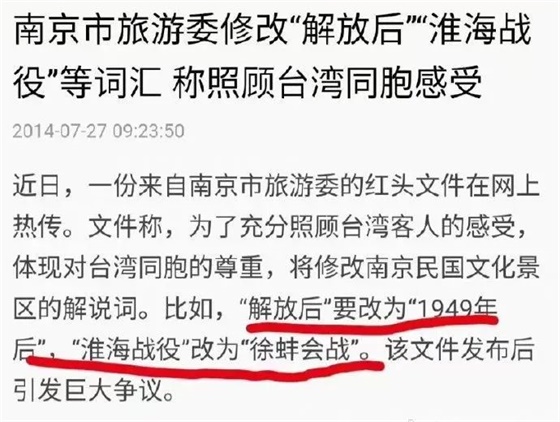 第二,2014年7月,南京市旅游委发了个红头文件,要把南京民国文化景区的解说词中的“解放后”秘说为“1949年后”,把“淮海战役”改为“徐蚌会战”。