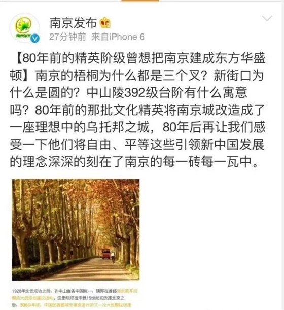 第六,2016年,南京的官方账号鼓吹“八十年前的精英阶级” 。