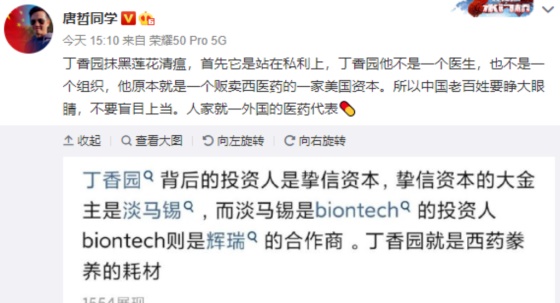 丁香医生的贬低中医的目的,不是为了泛泛地支持中国发展西医,人家的重点怎么看都是在支持外国的西药。最明显的一次,就是2022年上半年,丁香医生热捧从美国进口的辉瑞高价药,又以“树靶打靶”的方式攻击中国的中医药连花清瘟胶囊。这种捧一踩一的做法过于简单粗暴,激起了很多人的愤怒以及对丁香医生的质疑,所以很多人开始查各种公开资料,了解丁香医生的背景,不查不知道,一查吓一跳,果然发现了很多令人吃惊的事实。