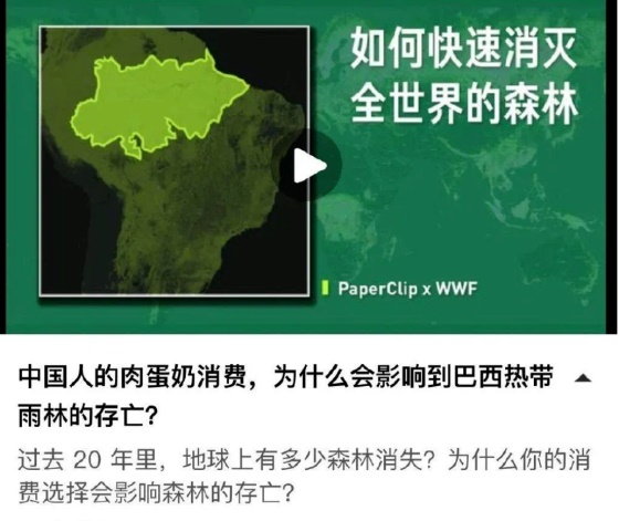 回形针把巴西雨林消失的原因,说成是中国人吃肉蛋奶。