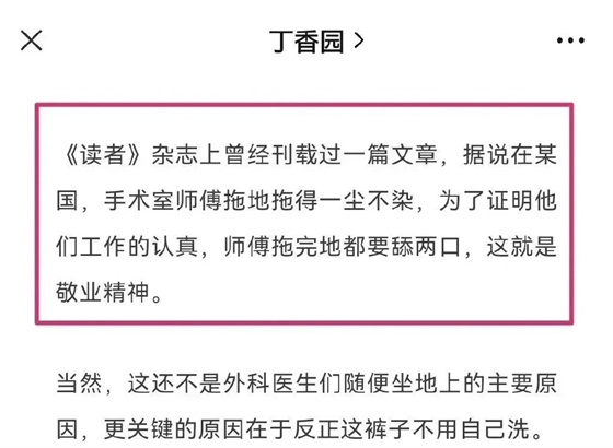 丁香医生不但喜欢打着现代医学的名义反中医,还喜欢打着科普的名义反智,其反智的巅峰之作,我认为还是7月25日那篇《主任爱坐在地上的原因找到了》,援引《读者》曾刊载的一篇文章,为鼓吹人日本的手术室一尘不染,竟然说清洁工师傅拖完地都要舔两口。他们以为中国人还在相信夏令营日本的孩子比中国的优秀,日本马桶里的水直接可以饮用呢。
