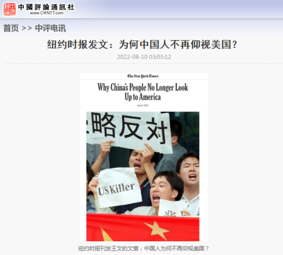 编者按:2022年8月10日,美国《纽约时报》刊发中国学者撰写长文《为何中国人不再仰视美国》。作者中国人民大学重阳金融研究院执行院长王文在文中用生动亲历与历史事例讲述,中国曾无限仰视美国,但美国轰炸中国驻南联盟使馆、军事入侵阿富汗伊拉克、国际金融危机等错误政策彻底毁了美国在中国人心中的形象。“尽管中国还有不少值得向美国学,且中美有许多共同之处,但中国不会随着美国坠入悬崖”。该文刊发后,中肯的语气、真诚的表达,迅速在美国舆论界形成广泛影响。本文中文版发布于观察者网,中国评论通讯社报道了本文的刊发。