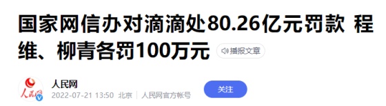 可是最后对滴滴的处罚,是罚款80.26亿人民币,对柳青个人的处罚,是罚款100万人民币。