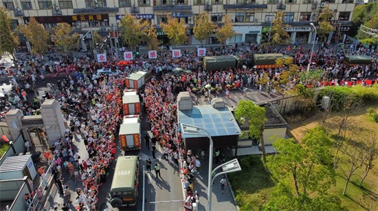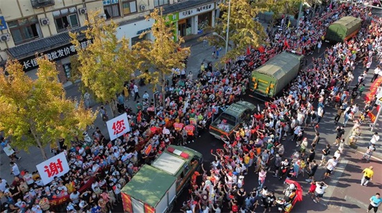 当日上午,消防指战员们在西南大学集结,然后乘车离开。重庆人民夹道欢送,车辆只能缓缓前行。大街上,大家挥舞着国旗,竖着大拇指,齐声高喊:“雄起!雄起!”有人不停想往车上塞东西,还有人追着车奔跑,消防员们敬礼、比心,回应着群众似火的热情。