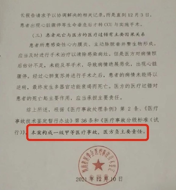 湖南医学会的专家们研判认为,患者有这样的病情,应当及早进行手术,清除感染病灶,但是医方没有,导致病情恶化,出现心脏骤停,最后撒手人寰。