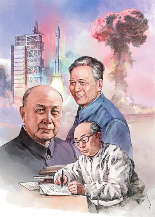 ▲本书插图:钱学森、邓稼先、于敏那一代科学家留给后人更宝贵的财富是“自力更生,艰苦奋斗”。