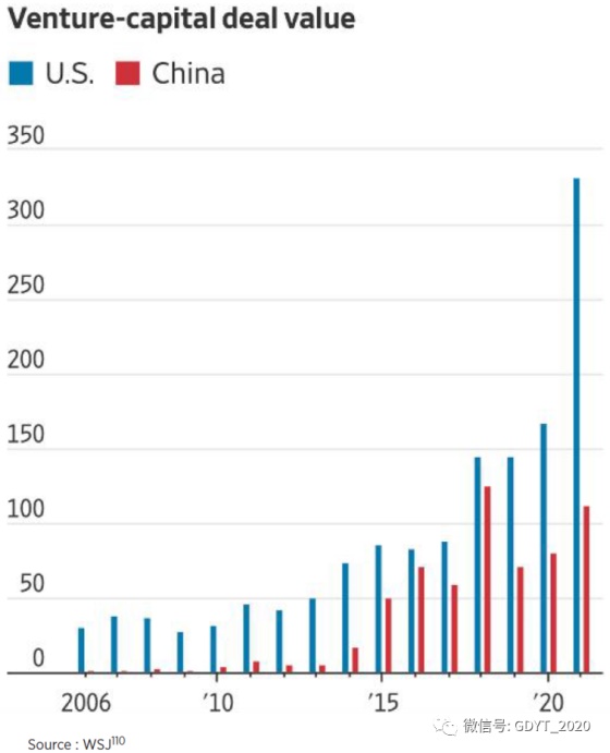 但在作为“现代资本主义的第三大机制”的风险投资方面,中国企业在吸引新投资者和资本的能力上仍远落后于美国企业。2020年,中国初创企业获得的风险投资数额仅为美国公司的一半。这一比例在2021年进一步下降至三分之一,具体如下图所示。在释放人的潜力和创新能力方面,美国仍然是无与伦比的。