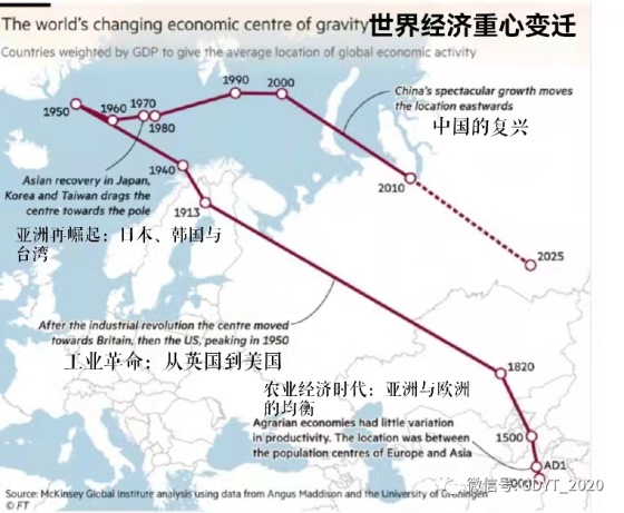 上面这张由英国《金融时报》制作的图片提供了一个历史视角,说明中国的经济增长是如何转移全球经济重心的。两千年前,亚洲是世界上最大的经济体。随着工业革命的发展,经济重心转移到了欧洲,然后是美国。今天,经济重心又转移到了以中国为首的亚洲,并对所有其他经济体产生了强大的引力。