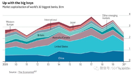中国在银行业的崛起更引人注目。2000年,全球十大银行没有一家来自中国。如今,全球最大的四家银行都属于中国(截至2020年12月,资产总价值为17.3万亿美元)。前十大银行中,只有第六家和第九家为美国银行,资产总价值为6.2万亿美元。不过如果按照市值来计算的话,美国企业占据着第一、第二、第五和第七位。正如《经济学人》所说明的,世界前30大银行中,美国银行的总市值为1.1万亿美元,远远领先于中国银行的9720亿美元。