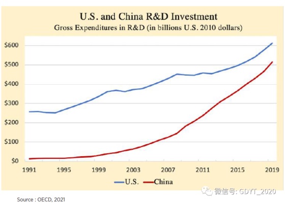 2020年,美国艺术与科学院发布了有里程碑意义的报告《自大的危险(The Perils of Complacency)》。这份报告显示,中国的研发支出增长迅速,很快就要超过美国。报告并警告说:“美国的未来取决于采取措施确保研发企业的活力和生产力”。