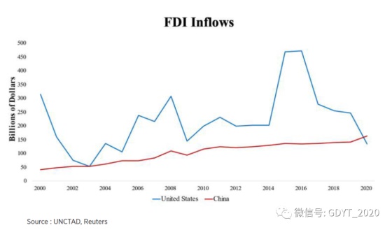 在过去20年里,中国已经逐渐发展为和可以与美相媲美的FDI优先目的地。2020年,中国成为吸纳外商直接投资最多的国家。2000至2020年,流入中国的外商直接投资额由410亿美元翻了四倍至1630亿美元;与此同时,流入美国的外商直接投资额上下波动,20年净下降了1800亿美元。不过,在外商直接投资的累计数额上,美国依然遥遥领先:2019年流入美国的外商直接投资累积数额是中国的五倍。