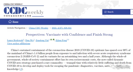 2022年9月16日,《中国疾病预防控制中心周报》CCDC周刊英文版在线刊发文章《Perspectives:Vaccinate with Confidence and Finish Strong》,肯定过去两年多来国内疫情防控工作取得的成绩,提出:疫苗是结束新冠大流行的关键因素,需要适时“接种第二加强针”。