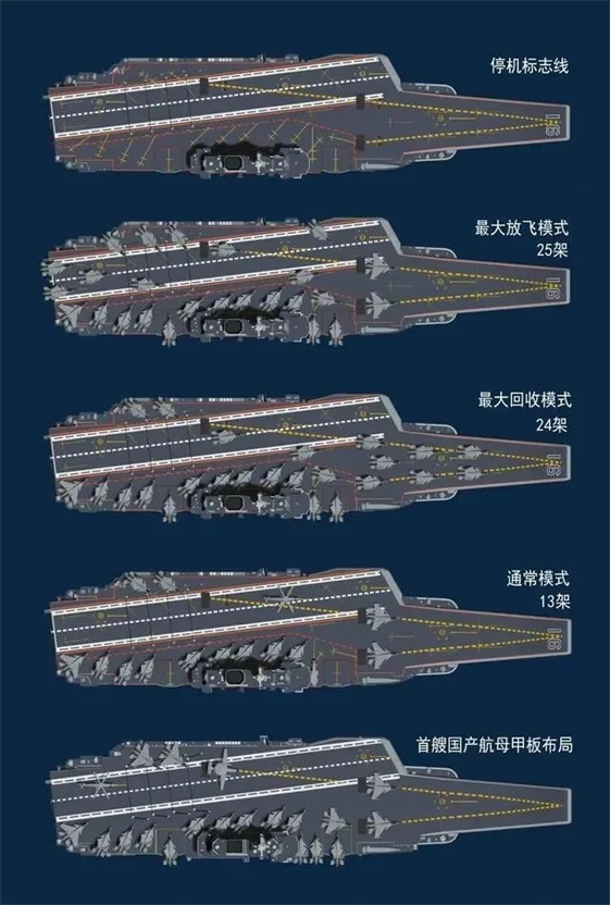 尽管在战时可以一边放飞舰载机,一边用升降机从机库提升舰载机,不需要全部舰载机到甲板就能进行舰载机出击任务。但辽宁舰这种甲板全状态也是有战术意义的。这种全状态可以分为两波次出击,红线连接的是第一波次,主要在左舷,从舰首到舰尾有12架歼-15。然后右舷的第二次,也是12架歼-15。