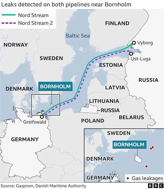 巧的不是海底天然气管道泄漏,巧的是一天之内北溪1号、北溪2三处管道泄漏,这就巧得过分了。先是丹麦发现北溪二号两处管道泄漏,再是瑞典发现北溪一号管道也发生了泄漏……前后都在24小时之内,还都在博恩霍尔姆岛附近。