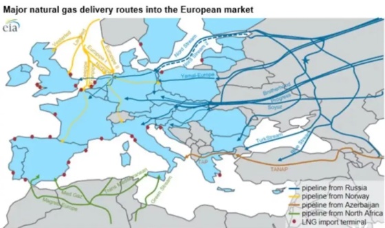 欧洲的天然气管道,黄色是挪威的。