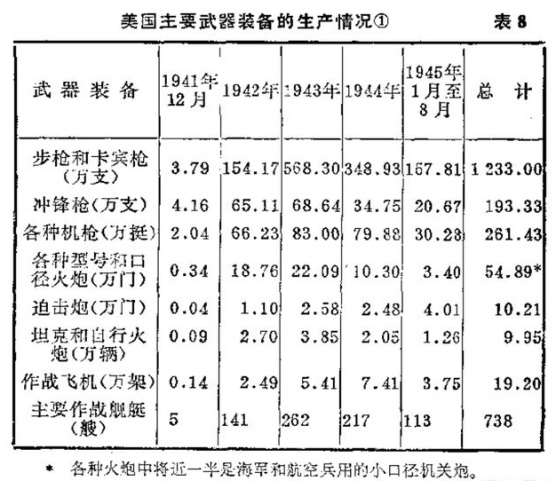 二战期间,美国制造各种作战飞机 19.2万架、各种坦克和自行火炮9.95万辆、238万辆卡车 、8.76万艘军舰 、0.54万艘货轮 、582.2万吨飞机炸弹 、2008.6万件轻型武器和440亿发轻型武器弹药。
