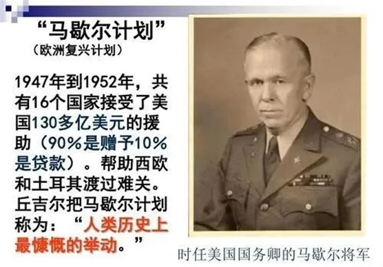于是,美国提出了一个计划,这个计划叫做“欧洲复兴计划”,也叫做“马歇尔计划”。