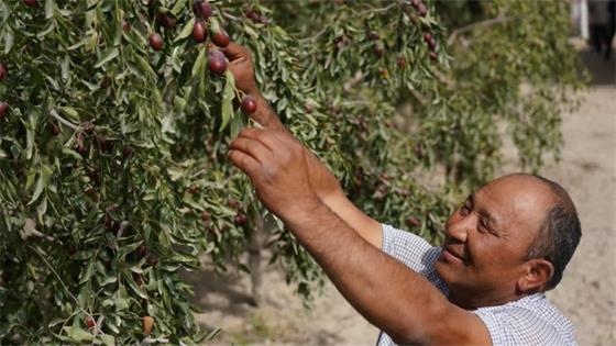 2021年9月27日,新疆喀什地区麦盖提县央塔克乡,枣农艾买尔·开木白观察红枣长势 张啸诚 / 摄