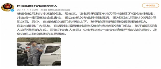 11月1日@白沟新城公安网络发言人称,经核实,该名男子因驾车持刀闯卡违反了相关法律规定,并造成一定程度社会危害性,但公安机关考虑其特殊情况,仅对其处以罚款100元的行政处罚。另外,在当地相关部门的帮助之下,孩子的奶粉问题已经得到妥善解决。
