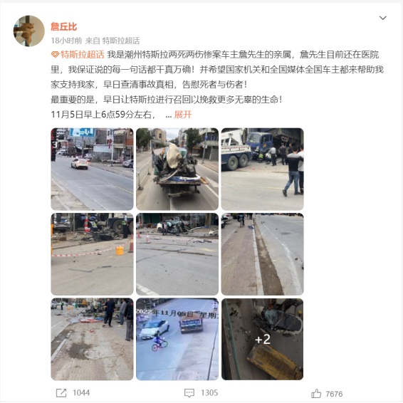 11月12日晚,自称为事故司机亲属的用户@詹丘比在微博上发布长文介绍了事故情况,表示特斯拉出现了突然加速、制动失灵的问题,车主詹先生目前还在医院里。