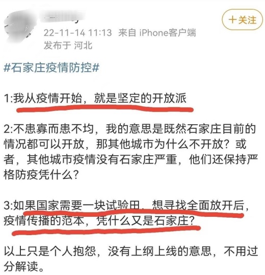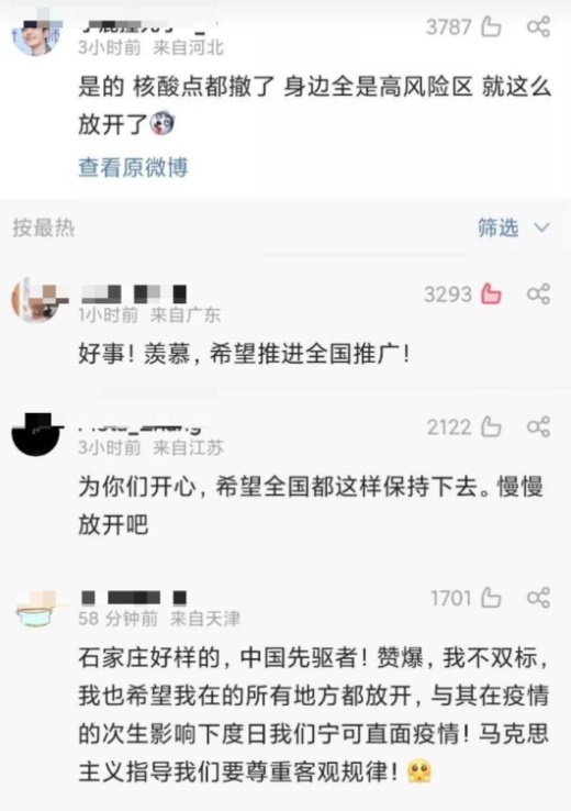 一位从疫情开始就是坚定开放派的人,说如果石家庄可以开放,那凭什么其他城市不开放,其他城市疫情还没石家庄严重,凭什么其他城市还保持严格防疫。