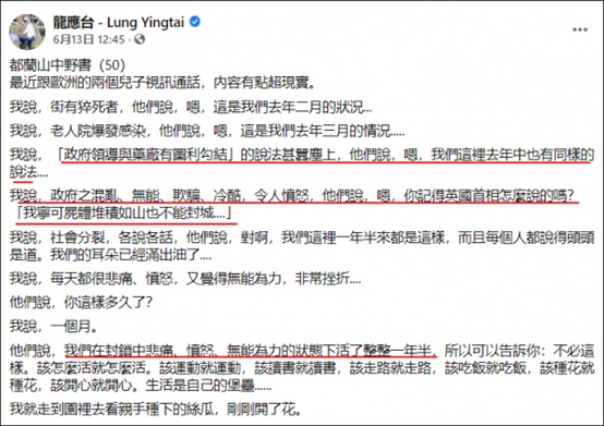 不过,龙应台也就只敢说一句“惶惶不可终日”而已,她对于台当局一边放任疫情爆扩一边是拼命的隐瞒真相,对于台岛缺水、缺电、缺疫苗的,对任何敢说台岛疫情真相的岛民立即抓捕、起诉的暴行,却是一个字儿都不敢说。