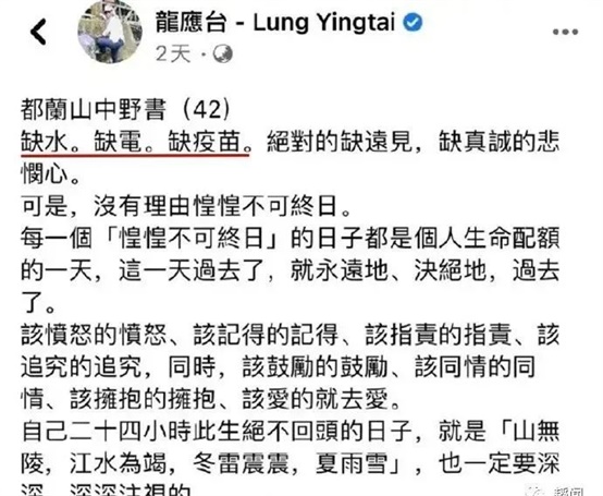 不久之后,台岛疫情大爆发,每天新增数万病例、每天死亡最多时数百人的惨剧,龙应台说台湾目前“缺水、缺电、缺疫苗”,还“绝对缺远见”、“没有理由惶惶不可终日”了。看看,这时的龙应台不说加强疫情防控是“合理化极权体制”了,反而嫌台当局抗疫不力了。