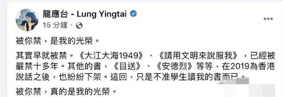 一直到今年8月时,才有龙应台的书全部下架的传言。8月31日龙应台还曾为此在社交媒体上叫嚣“被你禁,真的是我的光荣”。