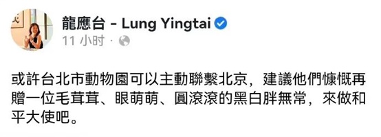 龙应台发的帖子说:或许台北市动物园可以主动联系北京,建议他们慷慨再赠一位么茸茸、眼萌萌、圆滚滚的黑白胖无常,来做和平大使吧。