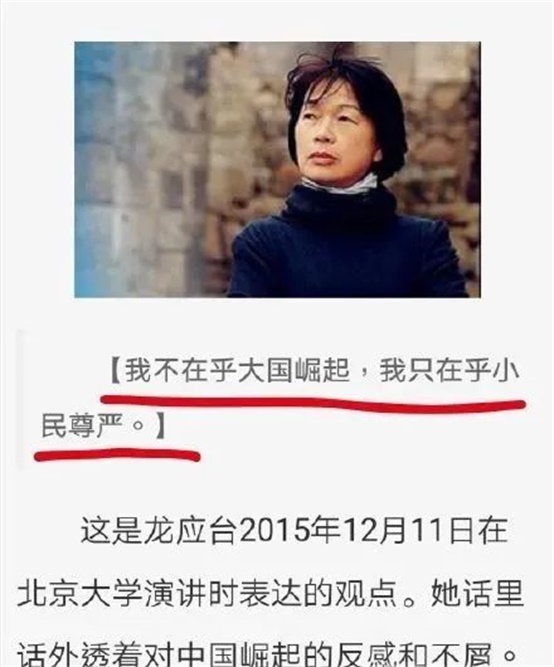 所以,龙应台一不想中国“崛起”,二不在乎大陆与台湾之间的“血浓于水”,她所想要的无非是我们一直贫困落后,无非是妄想阻止我国家统一,无非是妄想拒绝中华民族的伟大复兴。