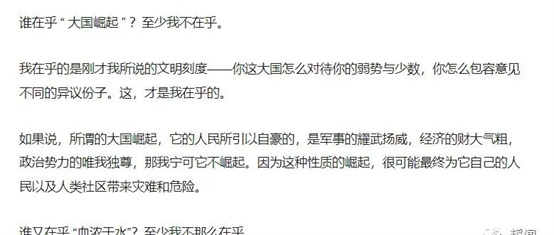 简单的一句“我不在乎大国崛起,只在乎小民尊严”,她就将中华复兴同人民尊严进行了切割、撕裂,完成了恶意挑拨、诱导对立的任务。