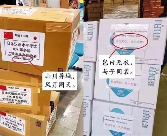 后来从日本寄来支持武汉抗疫的物资包装上写有“山川异域,风月同天”等中国古诗词内容。