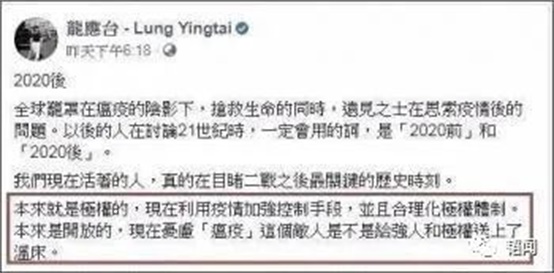 武汉初发疫情后,在我们国家“为救万民于水火”进行伟大“战疫”时,龙公知公然诋毁、污蔑我们的战疫是在“合理化极权体制”。
