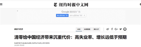 在国内两派为是放开还是继续“动态清零”争辩不休之际,西方也没有闲着,继续对中国的防疫政策无差别发起攻击。众所周知,疫情以来,西方舆论一直对中国的“动态清零政策”各种抨击。但如果认为中国选择像西方一样放开,西方就会停止对中国的攻击,那就大错特错了。《纽约时报》仅用3天时间就向我们证明,不管中国怎么做,西方都不会停止对我们的攻击。 11月30日,《纽约时报》继续像往常一样发文抨击中国的“动态清零” 政策。然而,随着中国防疫政策优化,各地“逐步放开”,12月2日,《纽约时报》又来了个急转弯,谴责起中国的“逐步放开”。 11月30日,《纽约时报》以《清零给中国经济带来沉重代价:高失业率、增长远低于预期》为题报道称,“中国坚持的新冠防疫措施所造成的代价已对世界第二大经济体产生了广泛影响 :失业率达到了创纪录的20%,企业利润下滑,经济增长远低于中国的预期。” 文中写道,“人们对政府的“动态清零”政策感到失望,该策略未能阻止病例的大幅增加。”“目前的新增病例是中国自2020年大流行开始以来最广泛的一次,然而中国政府却一直拒绝在严格的防控措施上让步。但保持目前的政策,将对已经放缓的经济造成损害。” 《纽约时报》援引凯投宏观亚洲首席经济学家马克·威廉姆斯的话说,“不管中国做什么,都不免不了经济会被严重削弱”。另外还引用所谓惠誉负责中国政府信用评级分析师安德鲁·芬内尔的话警告,“中国不妥协的做法给经济带来严重压力,加剧社会紧急局势”。《纽约时报》认为,随着不满情绪的加剧可能会危害到中国“世界工厂”的声誉…… 总之,这篇文章的意图很明显:抨击中国的“动态清零”政策。 然而,随着中国出台防疫新规,多个城市 “逐步放开”,前脚还在指责中国管得太严的《纽约时报》, 12月2日又发文谴责起中国,宣称“中国开放恐致病例灾难性激增”,并引用各类所谓警告:“中国还没有准备好迎接大规模的浪潮”,“ 如果中国放弃‘清零’政策,将出现一场新冠病例的‘海啸’”,“ 中国的医院能力有限,突然取消“清零”限制会造成健康危机。”…… 《纽约时报》还例举了一堆“佐证”,所谓“老年人疫苗接种工作困难”“中国国产疫苗有效不如西方疫苗”等等。 看,《纽约时报》只用了短短3天的时间就向我们证明,在西方的世界里,不管我们做什么都是错。放开、躺平西方就不攻击了吗?不会,永远不会,西方最不缺的就是攻击我们的理由。 不可否认,疫情三年的严格管控,加上管控乱象、核酸乱象,让大家疲惫不堪,甚至出现不满情绪,但还是那句话,有问题的是人,不是我们的防疫措施。美国3亿多的人口,新冠疫情死亡人数超过100万。中国有14亿人,倘若不是防控措施有效,那死亡病例不可想象。 我们总是强调,取其精华去其糟粕,但说实话,这次的大流行,西方的累计确诊病例和死亡病例,失败的防疫政策,严重受创的经济,并没有值得我们学习的地方。所以,我们不应该盲目地要求政府向西方看齐。继续严格管控还是放开,要根据我们国内的情况来。跟着西方随波逐流,听从西方的建议只会让我们的情况变得糟糕,西方可不希望我们过得好。 因此,我认为继续为防疫政策争吵无济于事,也不要听西方说什么。我们现在需要的是整治管控乱象,核酸乱象。执行少量,精准有效的防疫措施。让防疫措施尽可能减少对人们的生活造成影响,让大家逐渐形成“抗疫新共识”,才能“压低疫情曲线”。这场“战疫”我们上半场打得还算不错,下半场依旧是一场硬仗,只有人心齐,才不会败给新冠病毒。 来源:孤烟暮蝉微信号