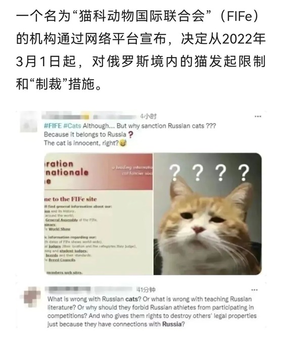 比如,他们说科学无国界,体育无国界,资本无国界,然后最后把这些领域的人都制裁了,甚至连猫都没放过。