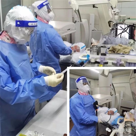 在治疗的过程中,崔永强和孔祥锴等医护人员穿上防护服,再穿上十几斤重的铅衣,外面还要套上手术衣,术后他们大汗淋漓,全身湿透,但是看到患者病情好转,他们无怨无悔。患者家属不知道该怎样表达感谢,说了一句“我们给你们医生护士买点连花清瘟吧”。