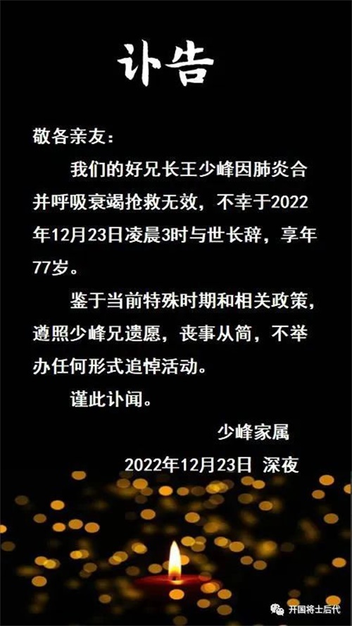 从王少峰同志亲属处获悉,开国中将王近山长子王少峰同志因肺炎合并呼吸衰竭抢救无效,不幸于2022年12月23日凌晨3时与世长辞,享年77岁。
