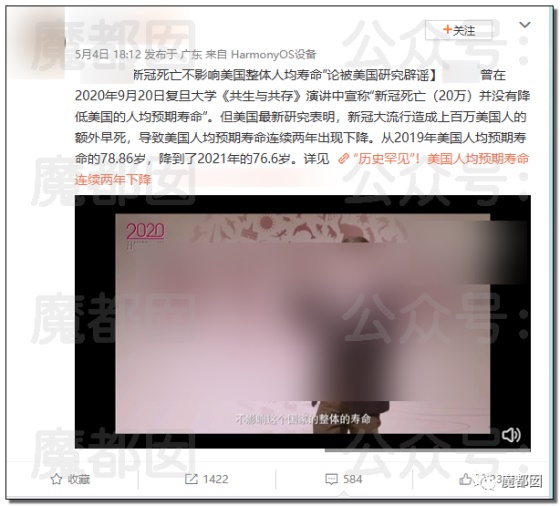 宣称“新冠死亡(20万)并没有降低美国的人均预期寿命”。实际上降低了3岁。