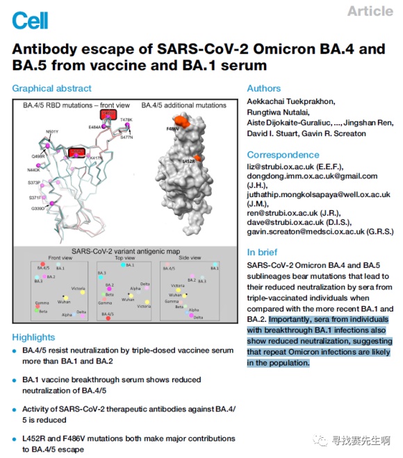 标注部分翻译:在接种BNT162b2疫苗(辉瑞mRNA疫苗)的个体中,Omicron BA.1突破感染产生的抗体对BA.2、BA.1和以前的关切变异株(阿尔法、贝塔、伽马、德尔塔)具有强烈的中和活性,但对BA.4和BA.5亚系却没有。