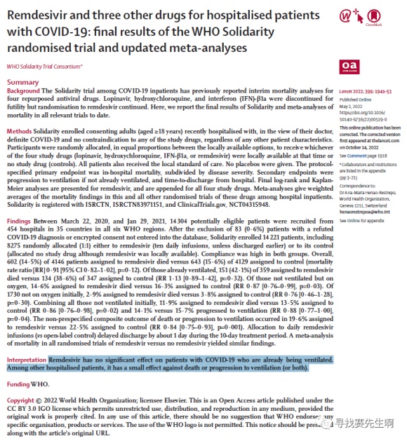 标注部分翻译:瑞德西韦对已经接受呼吸机治疗的COVID-19患者没有显著作用。在其他住院患者中,它对预防死亡或接受呼吸机治疗(或两者兼有)有很小的作用。